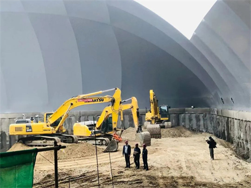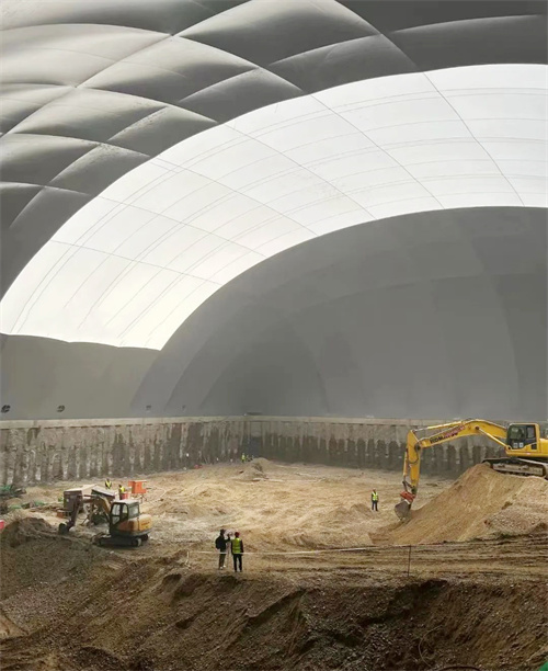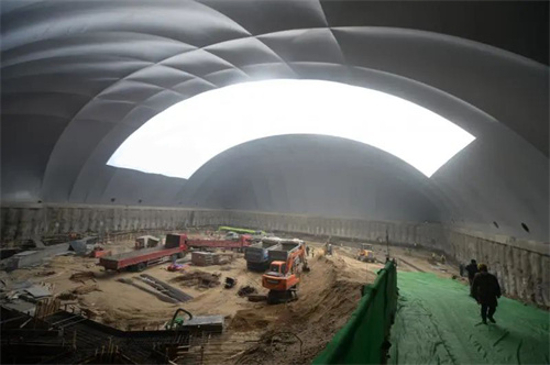 “基坑氣膜”建筑是采用內外氣壓差支撐的新型建筑結構,再利用斜向網(wǎng)狀結構加以固定,將膜材固定于地面基礎結構周邊,利用供風系統(tǒng)讓室內氣壓上升到一定壓力后,使屋頂內外產(chǎn)生壓力差以抵抗外力,由于利用氣壓來支撐,無需任何梁、柱,所以可得到更大的完全凈空的建筑空間。