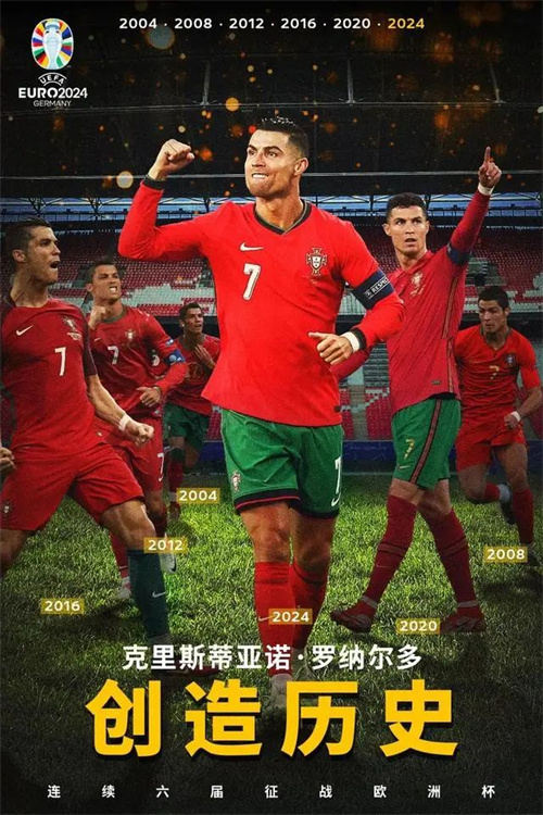 本場C羅首發(fā),他成為唯一一位連續(xù)六屆征戰(zhàn)歐洲杯的球員,創(chuàng)造歷史。
