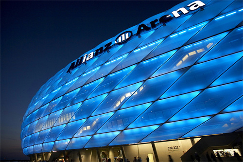 安聯(lián)球場的設計非?,F(xiàn)代化,外立面的LED燈可以根據(jù)比賽情況變換顏色,極具視覺沖擊力。當拜仁慕尼黑隊主場比賽時,體育場會變成紅色;當慕尼黑1860隊主場比賽時,體育場會變成藍色;世界杯比賽中,德國國家隊在這里比賽時,體育場則會變成白色。