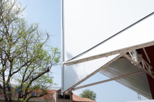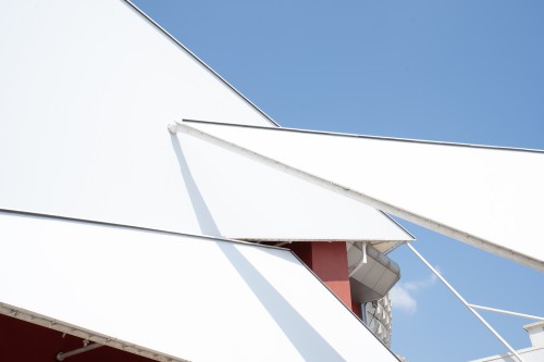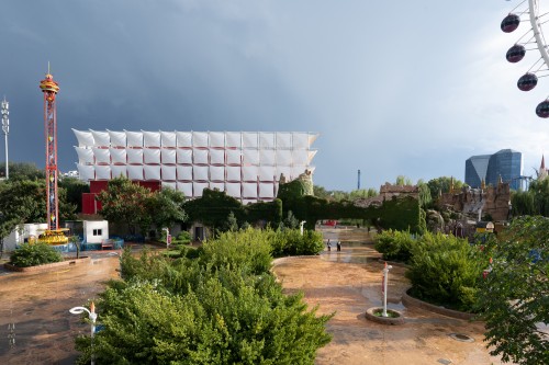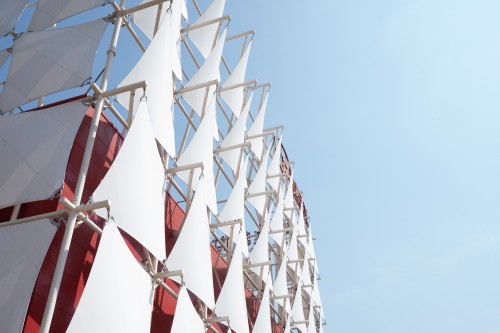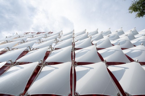 建筑采用了項目的主題色—紅色,先建造一個滿足建筑基本功能的體量,再通過在體量上疊加一個由膜材料構(gòu)成的靈活形式,創(chuàng)造出一個動態(tài)形象,這樣處理,不但縮短了施工周期,還大大降低了項目成本。