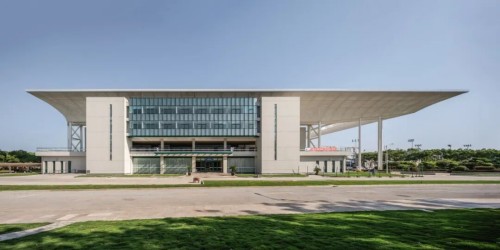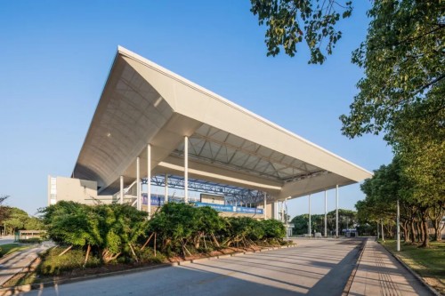 罩棚立面輔以網(wǎng)格膜結(jié)構(gòu)弧形飛檐設(shè)計(jì),進(jìn)一步強(qiáng)化了建筑舒展漂浮的質(zhì)感,讓場(chǎng)館視覺(jué)上更富層次感與藝術(shù)氣息。